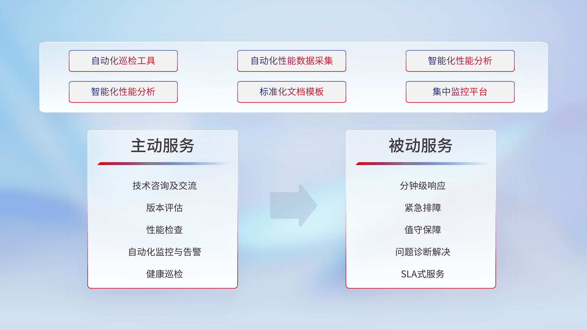 智能化工具和标准化文档,,保障服务质量,,,,提供主动服务(包含技术咨询、、、、版本评估、、性能检查、、自动化监控与告警、、、健康巡检)和被动服务包含(分钟级响应、、紧急排障、、、、值守保障、、、问题诊断解决、、SLA服务)。。。。