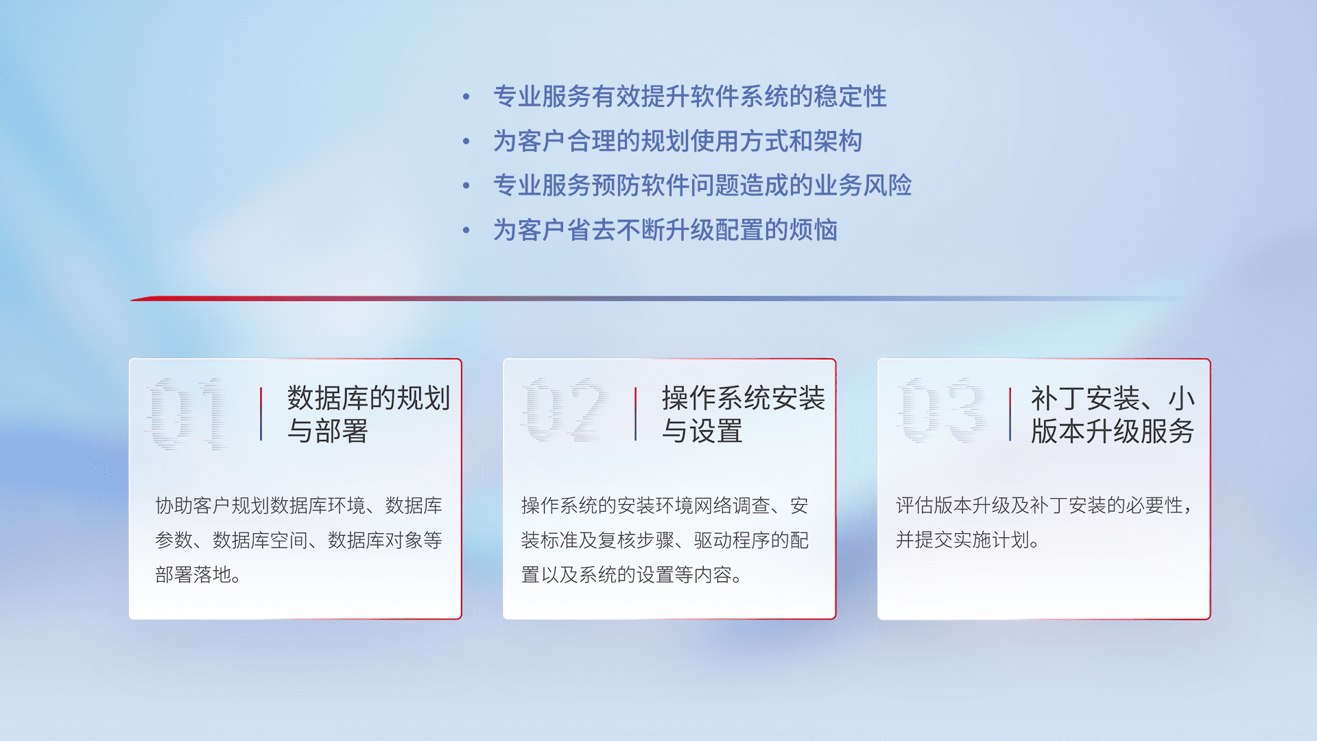 为客户提供软件规模升级、、、、快速部署、、按需配置的专业服务,,,从数据库的规划与部署到操作系统的安装与设置,,,再到补丁安装和小版本升级提供支持。。。